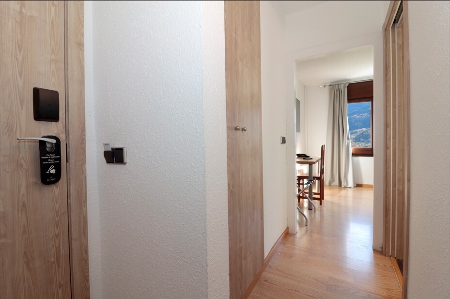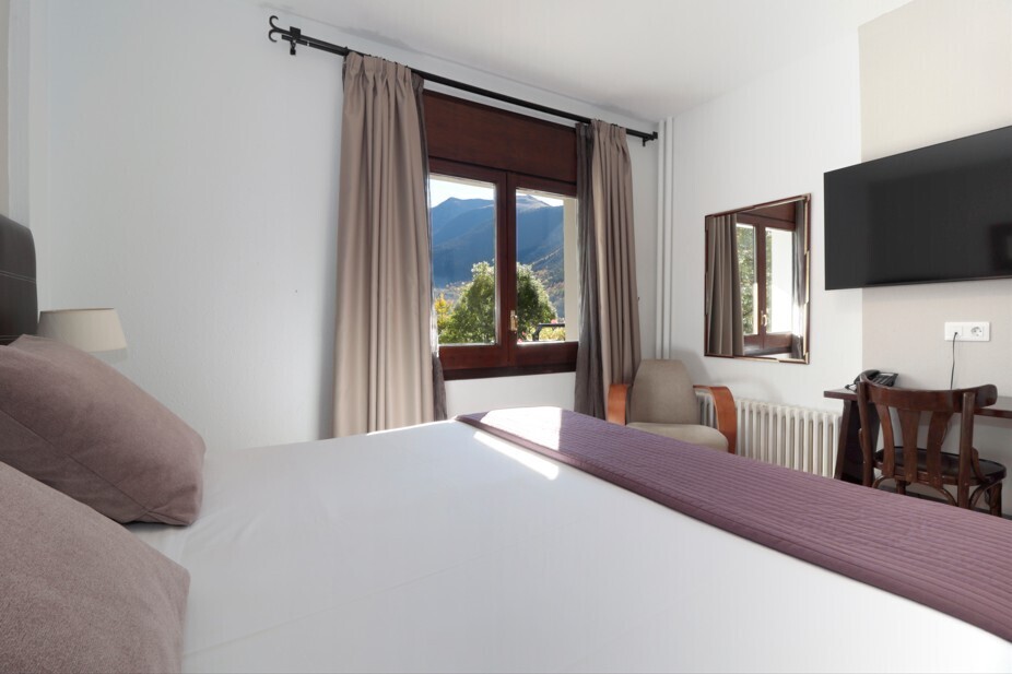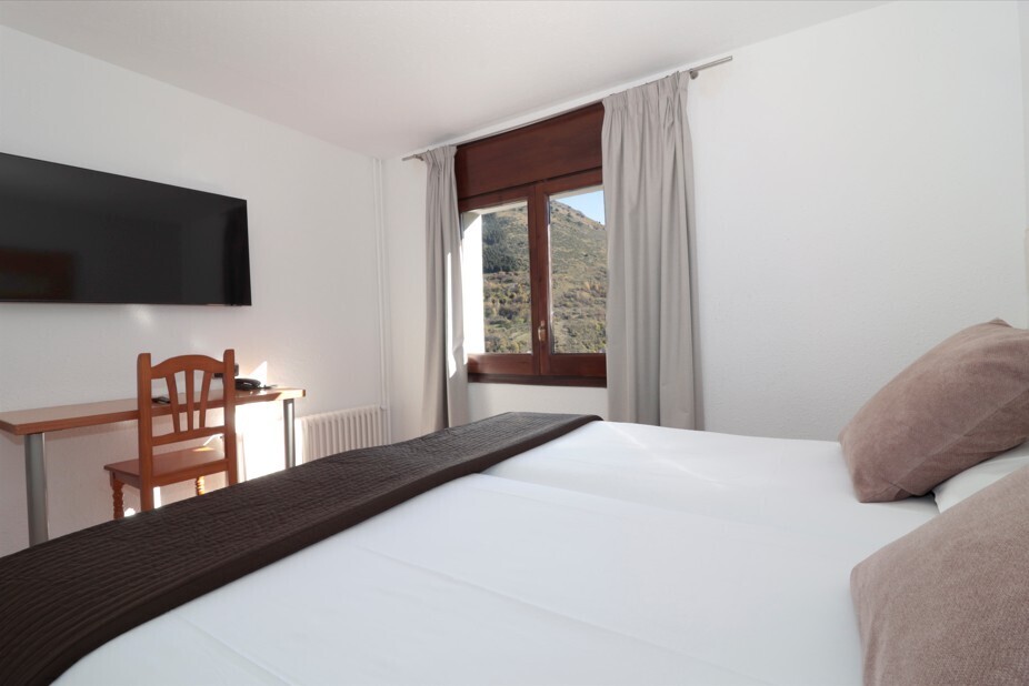 Spacious and bright room with fantastic views of the mountain, rustic style decoration, and wooden floor. It has 2 single beds or 1 double bed of 180x200, desk, flat-screen TV, and free WiFi connection. Fully equipped bathroom with shower and hairdryer.